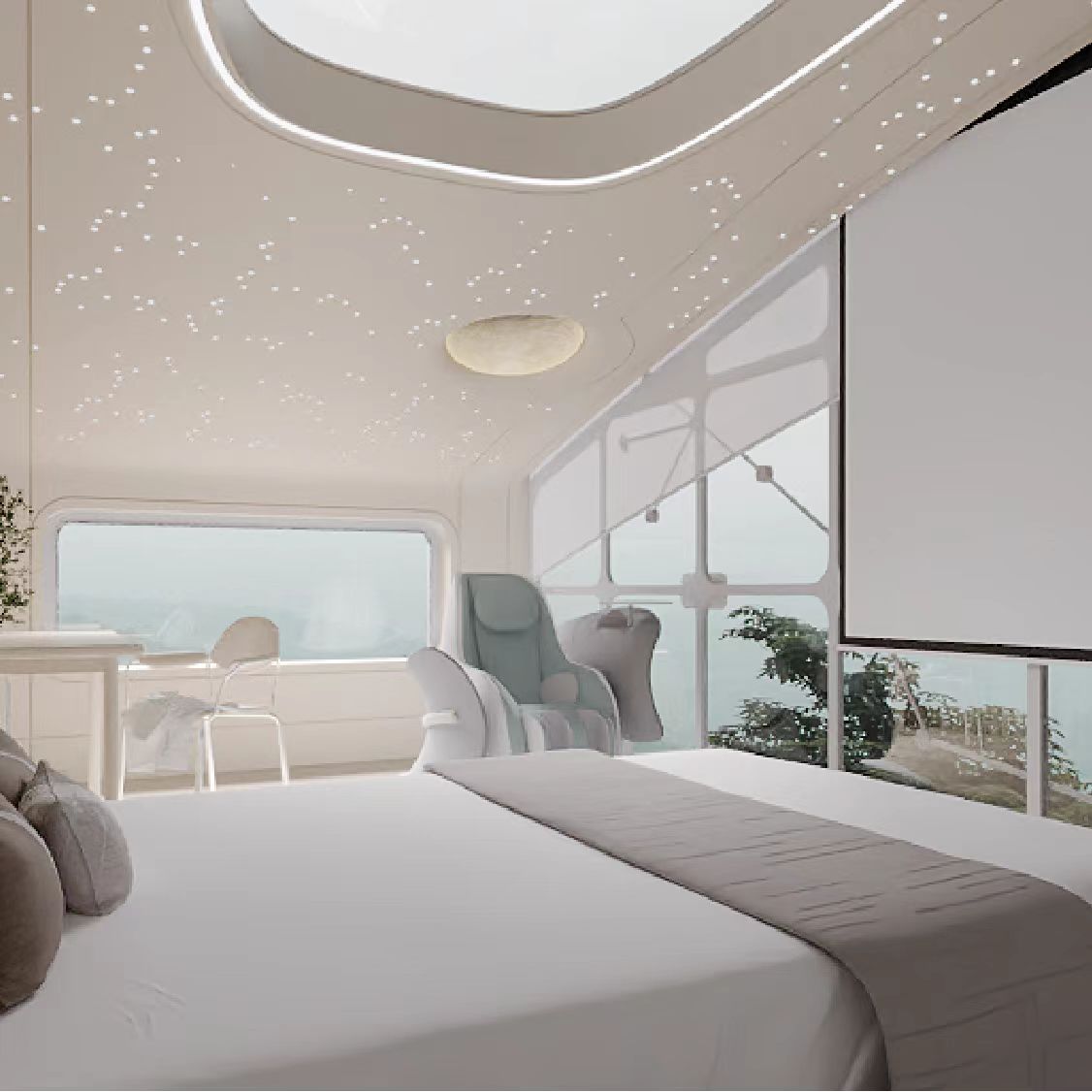 One of the highlights of our spacecraft homestay is the moon roof, offering you stunning views of the night sky and the celestial beauty above. Imagine falling asleep under a canopy of stars or waking up to the soothing sound of ocean waves or the rustle of canyon winds - truly a vacation experience like no other.